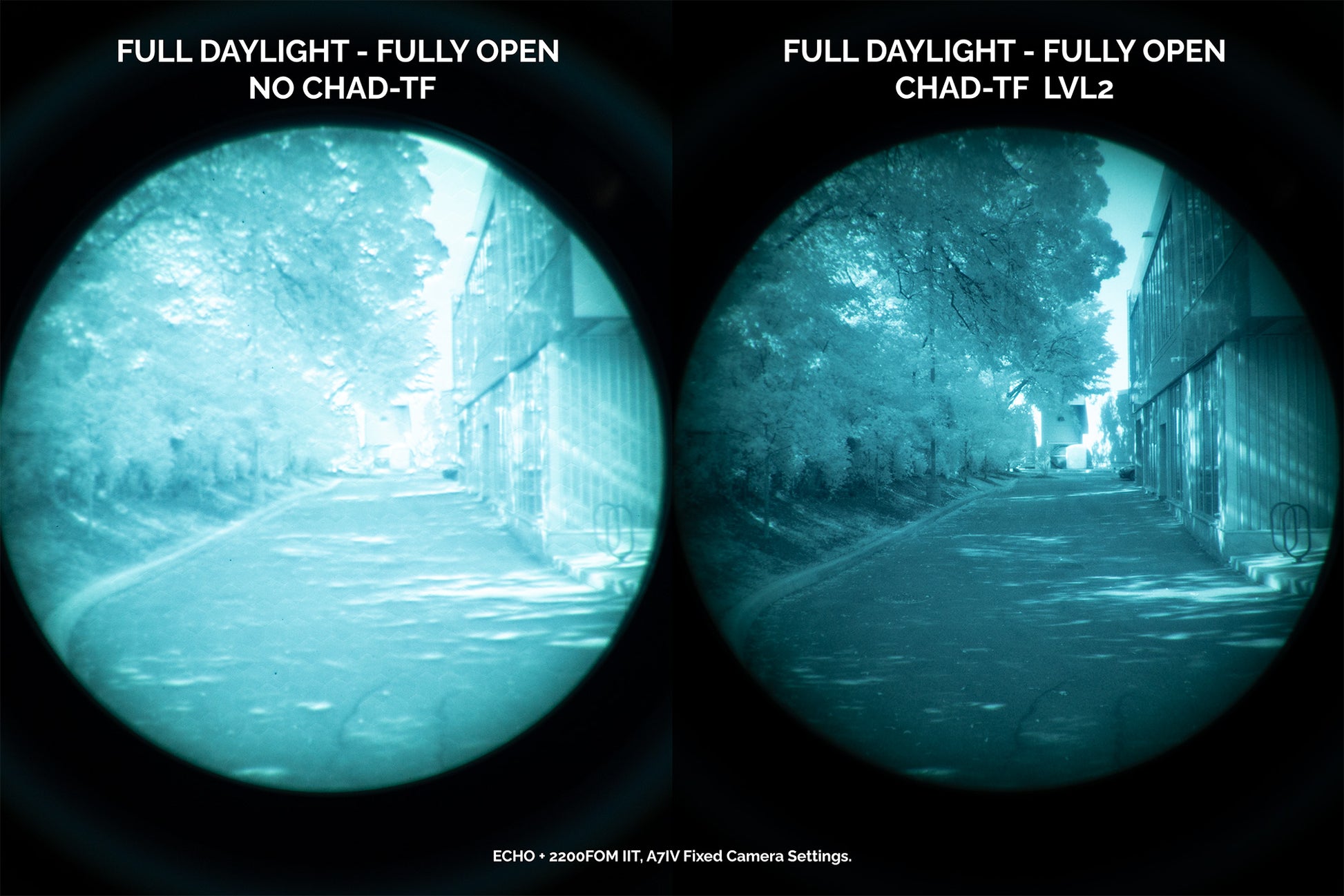 NOTE: Please exercise proper use with night vision device to avoid damage in lit environments, treat as if night vision is being used in standard mixed lighting environments, CHS does not take any responsibility for improper use or installation of the CHAD-TF or DTF filters. Filters are not designed to be used in direct sunlight or with lasers.