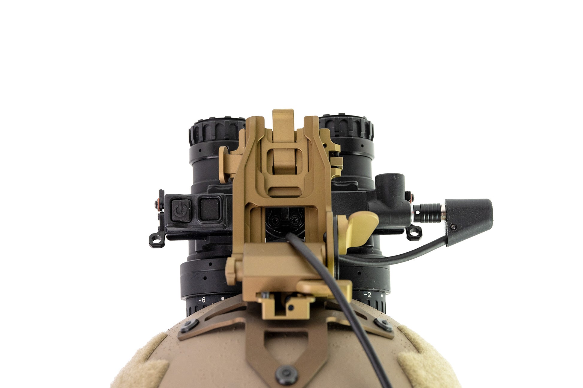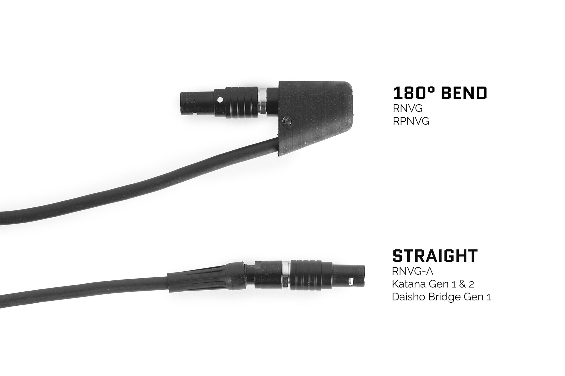 The cable is available with and without a bend-relief clip. The clip acts to safely turn the cable approximately 140 degrees at the LEMO end for improved ergonomics with RNVG and RPNVG devices (and others that have an outboard-facing cable receptacle). Installing the clip is easy - peel back the rubber factory bend-relief sleeve, and install the 2-piece clip. The rubber factory bend-relief sleeve can be cut off or retained to return the cable back to straight configuration.