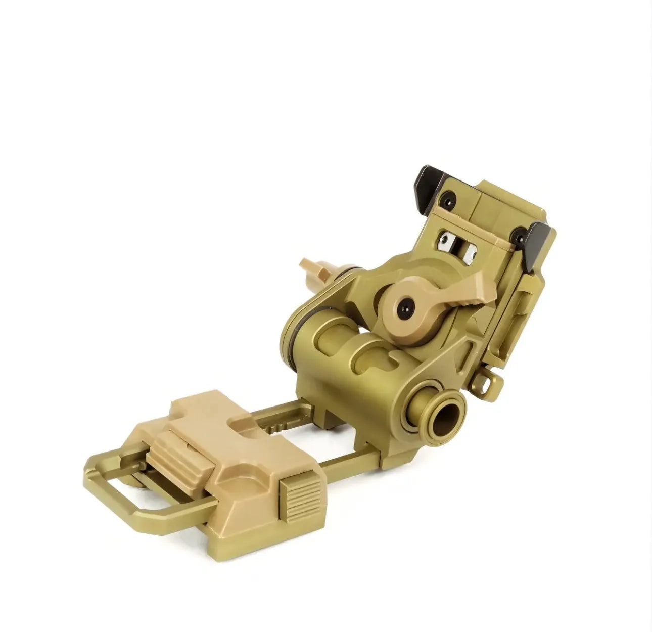 The LWNVM mount features a low profile design that sits very close to the helmet when stowed and lowers the operator's perceived weight of the complete night vision setup. The ergonomic design allows for simple one-handed operation for not only stowage/deployment, but also adjustments in all three axes. Additionally, the mount includes a safety breakaway feature that enables it to automatically detach from the helmet shroud when pressure exceeds its limit, preventing snagging on parachute cords or foreign objects. This enhances user safety during parachute jumps and running, reducing the risk of neck injuries.
