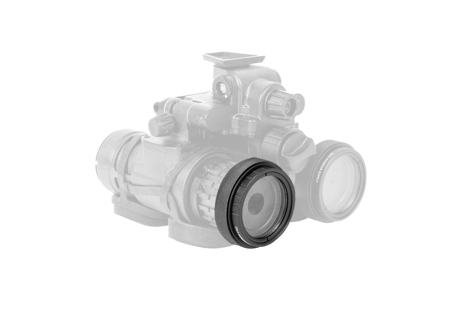 The iris diaphragm - originally designed for camera lenses without adjustable apertures - solves the focus issue on NVGs by giving the user the ability to dial in the optimal amount of light into the host NVG to maintain full-focus at all distances. By reducing the amount of light, the depth of field increases and everything comes into focus. Because the CHAD is larger than the NVG's objective lens, at wide-open aperture, there is no signal degradation.