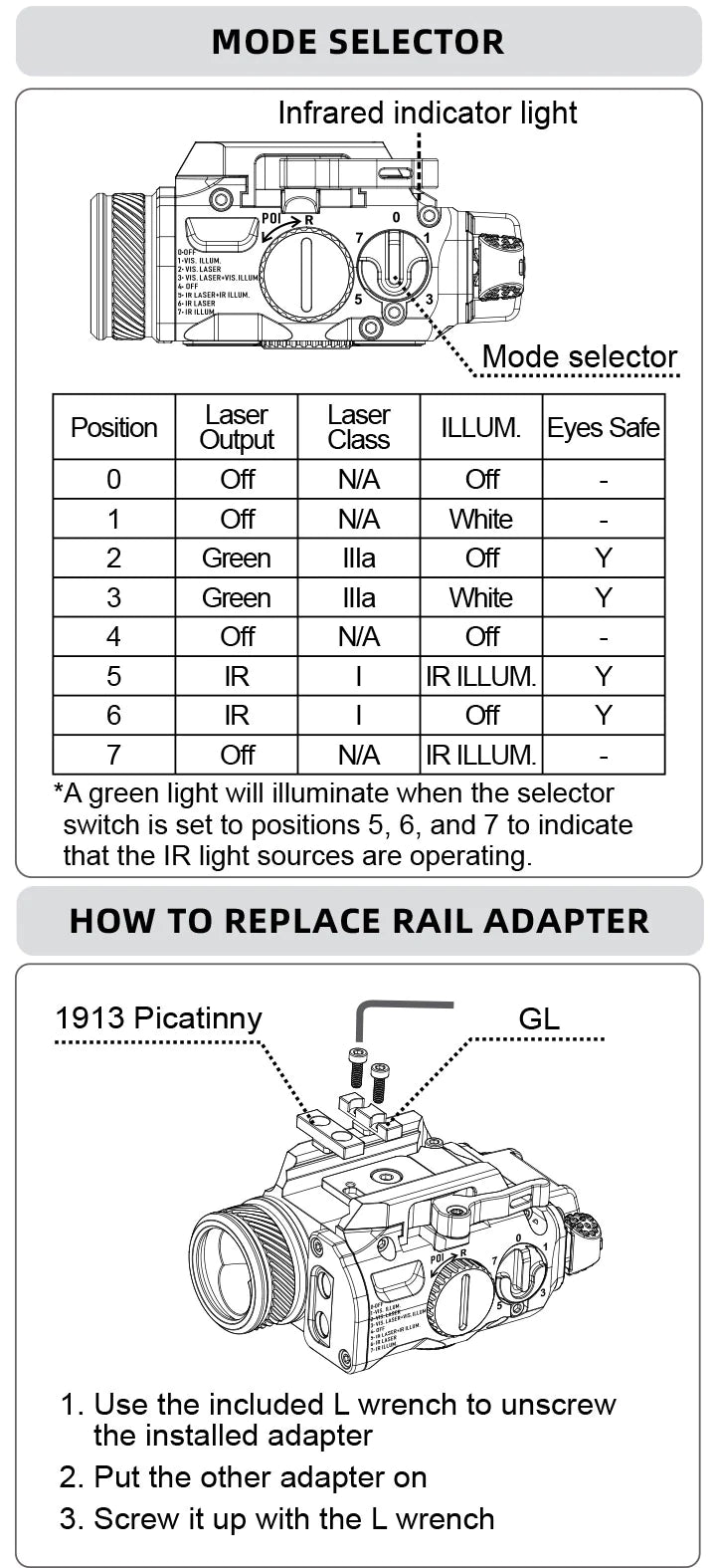 Designed primarily for pistols and small rifle platforms, the dual paddle switches are easily accessed from either side and provide multiple ways to actuate (push forward, pull down, or pull up; tap for constant-on; hold for momentary-on). The tool-free non-adjustable QD latch design allows for quick attachment and removal, and a discrete indicator shows when the IR light sources are in use. Powered by replaceable and easy-to-find CR123A batteries, also compatible with rechargeable Lithium-ion 16340 batteries, the GL4 Pro is IPX8 waterproof, making it suitable for a variety of harsh environments.