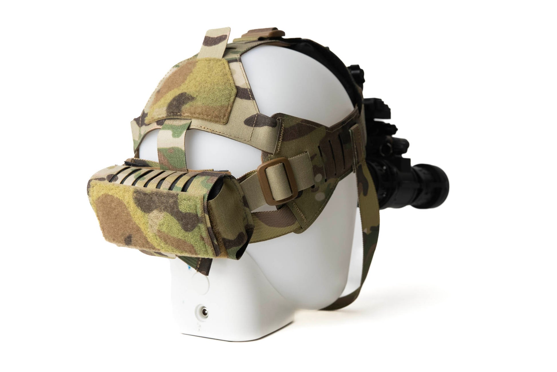 This pouch is specifically designed to work with the Tracer Tactical Head Harness due to the unique strap system, but could be adapted for use on other head-borne systems.