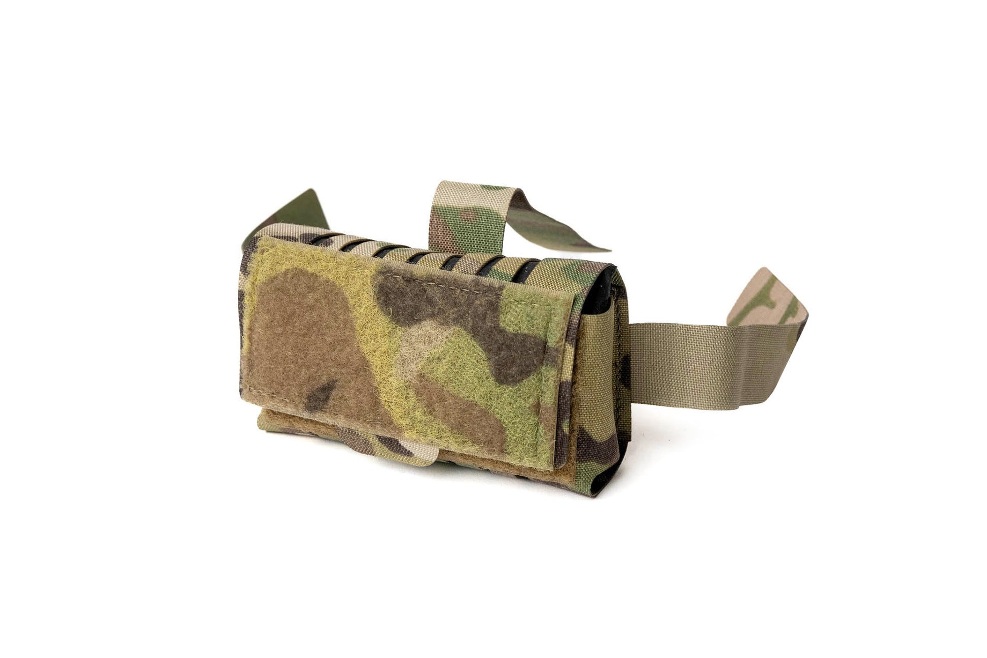 Large drainage slots allow water and debris to easily fall out of the pouch and the pouch comes with an extra triglide to attach securely to the harness. Pouch features exterior loop velcro for patches and interior hook velcro with a Cordura backer.