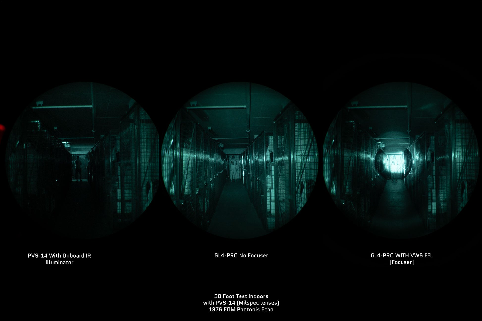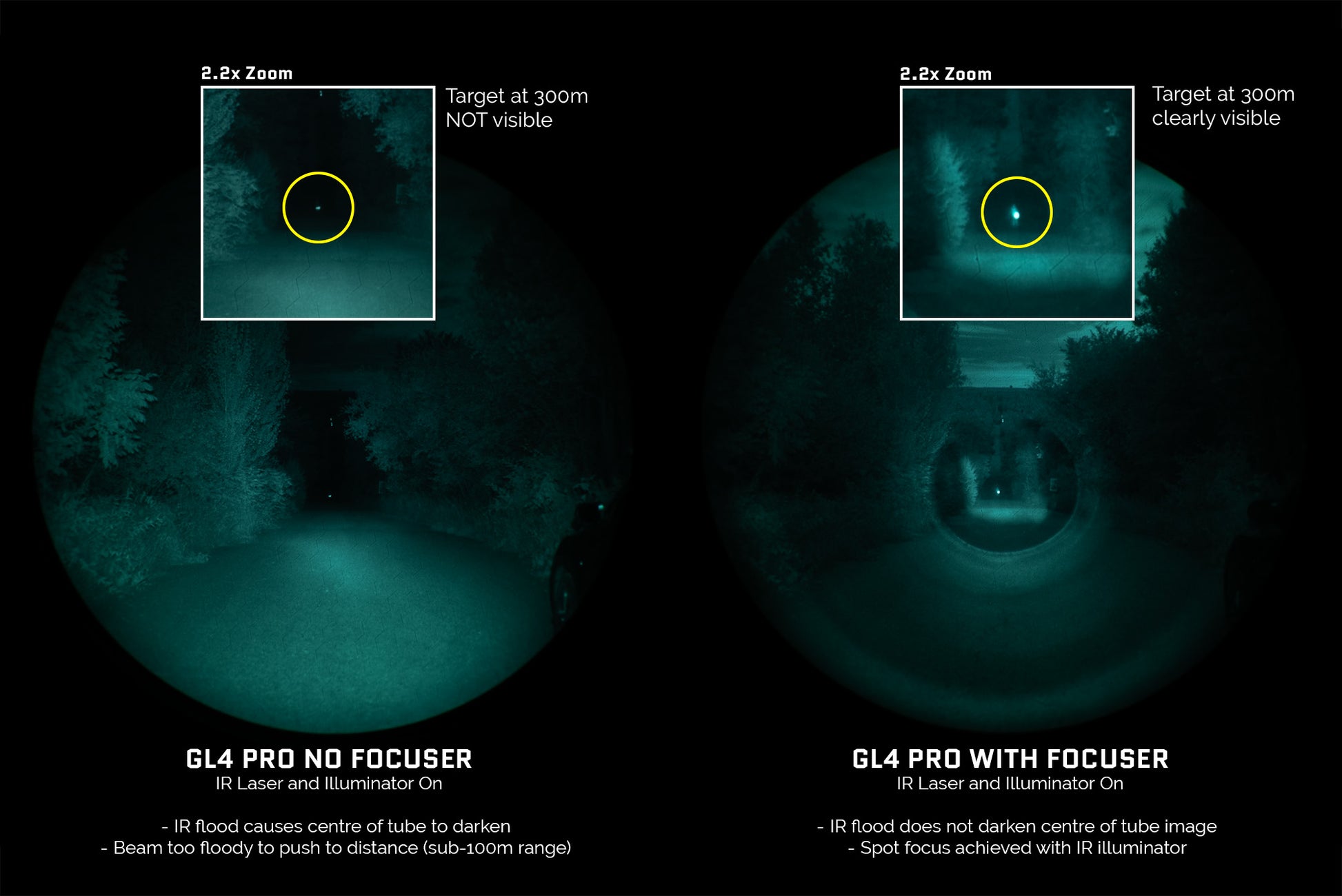 The Villain Weapon Systems GL4 External Focusing Lens addresses the wide flood pattern of the GL4's IR illuminator and focuses the 300mW beam into a tight spot capable of clearly illuminating your target past 100m. The focusing lens also eliminates the "washout" associated with the close-distance foreground flood illumination of the standard IR illuminator.