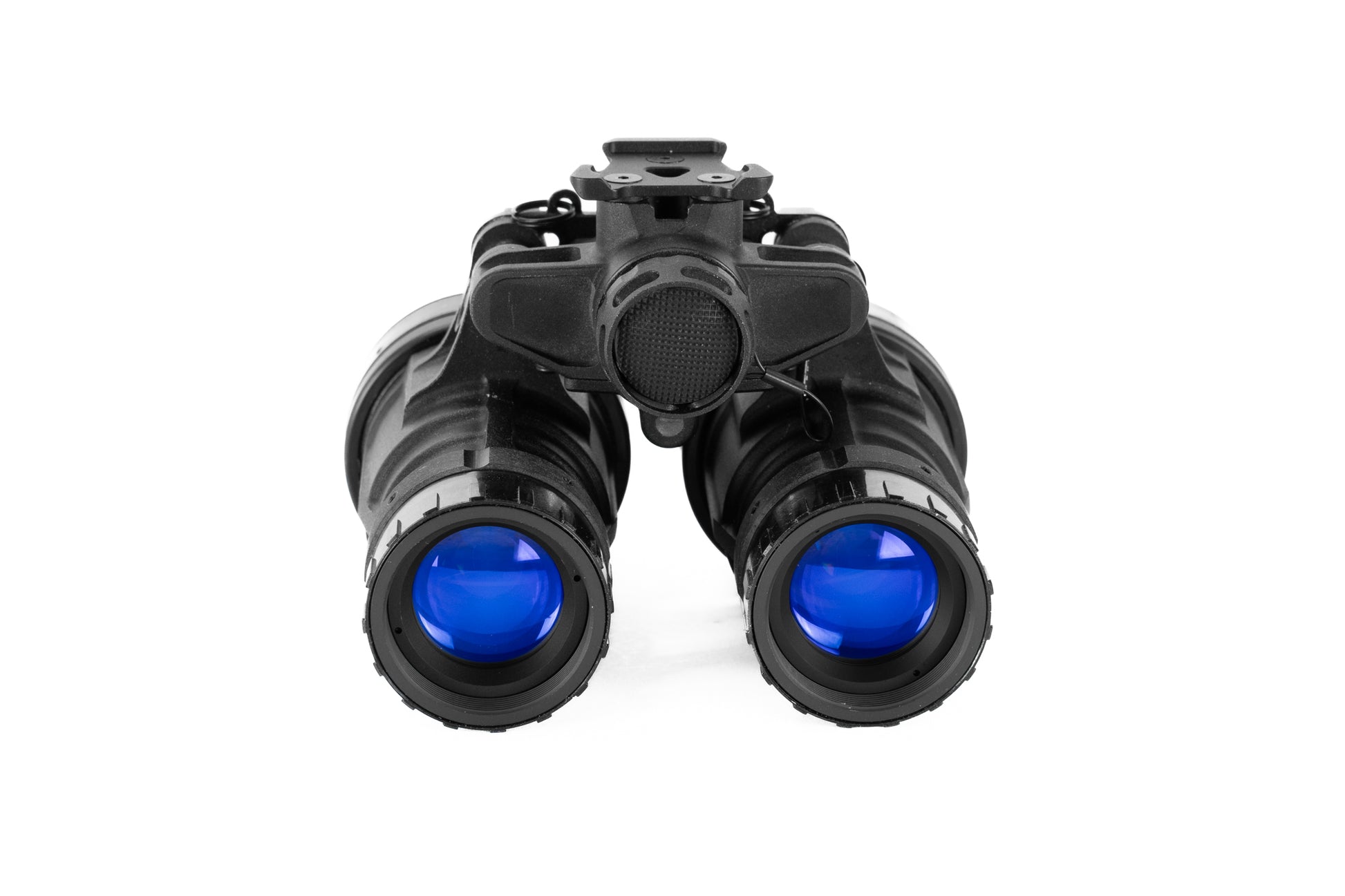 The articulating design allows users to use one eye or both eyes enabling the simultaneous use of a thermal optic or other non-passive aiming systems. This also enables users to operate vehicles without limiting head space by eliminating the need to stow the unit upright or to tuck the pods against the helmet when stowed.