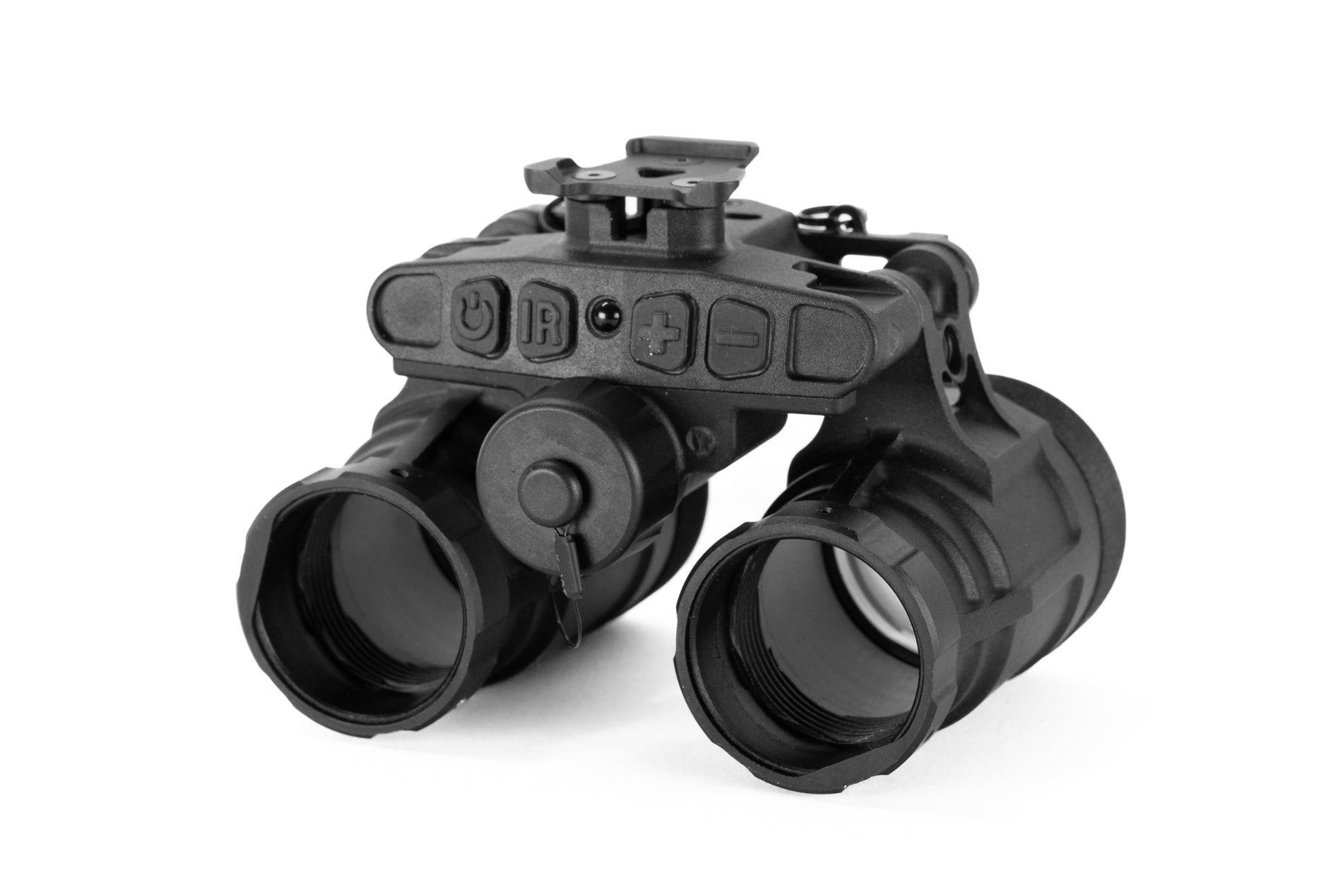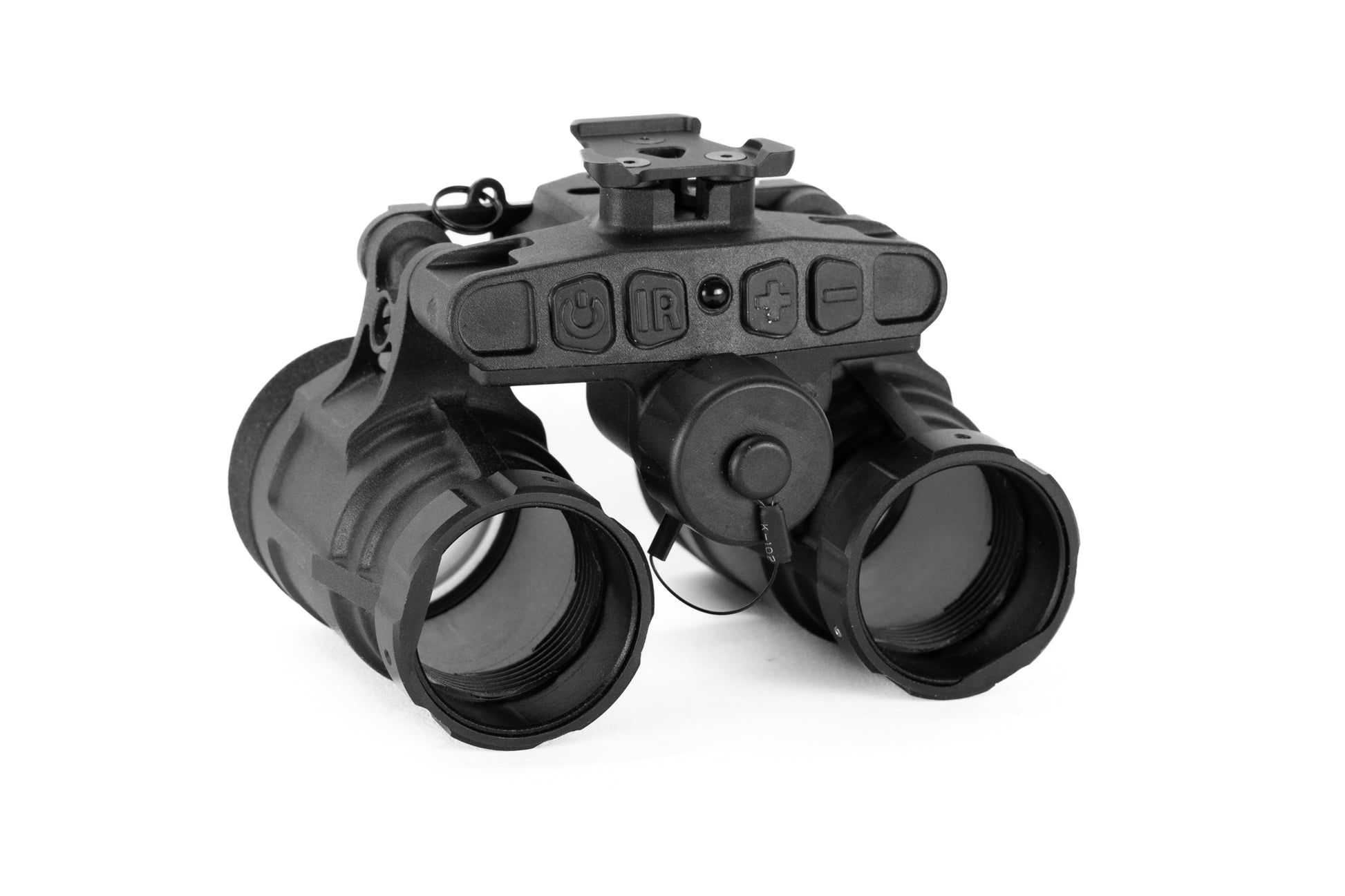 The articulating design allows users to use one eye or both eyes enabling the simultaneous use of a thermal optic or other non-passive aiming systems. This also enables users to operate vehicles without limiting head space by eliminating the need to stow the unit upright or to tuck the pods against the helmet when stowed.